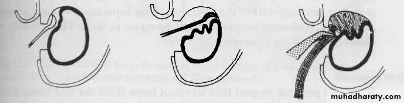 Where the lining is firmly attached, 1.5cm ribbon gauze soaked in saline or in diluted hydrogen peroxide may be packed carefully into the cavity to separate the two tissue.T he lining is sent for histological examination.