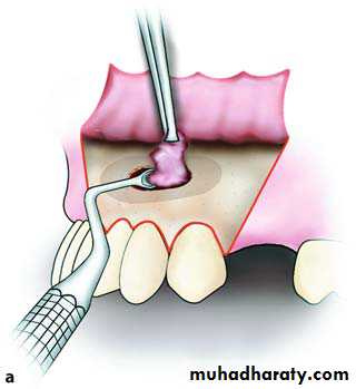 After reflection of the mucoperiosteum, the bone covering the lesion is evaluated, which, as mentioned , may be normal, thinned, or completely destroyed.