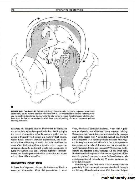 With no complicating factors, the mother can go into spontaneous labour provided the first twin has a cephalic presentation. When the first twin presents transversely, Caesarean section is indicated. When the first twin presents as a breech, clinician usually recommend delivery by elective Ceasarean section. this is largely because of the increased risk associated with singleton breech vaginal delivery. Other factors include dwindling experience of breech delivery and the rarely seen phenomenon of ‘looked twins’ (the chin of the first (breech) baby looked against the chin of the second (cephalic) baby).The ideal criteria for a twin labour are: