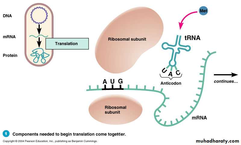 . 1st step in translation is the attachment of the small ribosomal subunit (30S) to mRNA at the start codon (AUG)