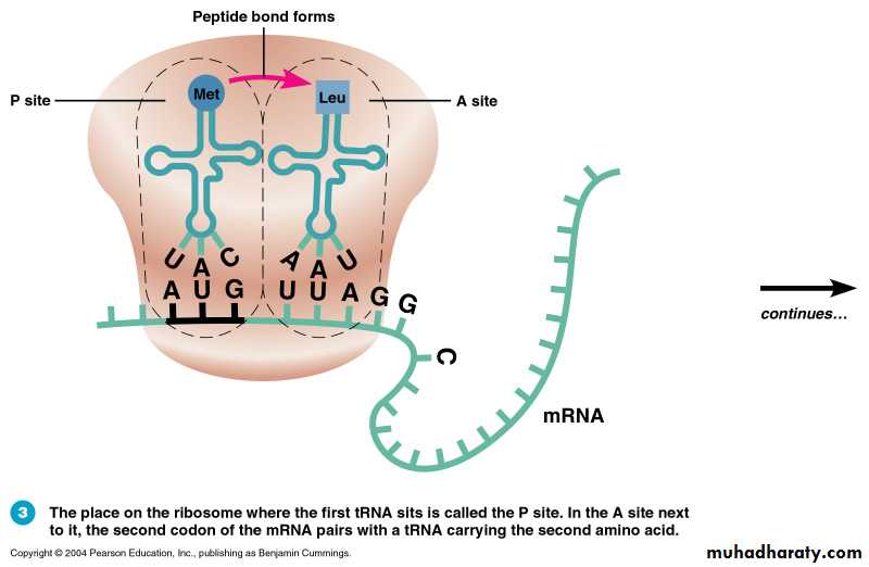 On assembled ribosome, a tRNA carrying the first amino acid is paired with the start codon on the mRNA. The place on ribosome where the 1st tRNA is located is called P site. tRNA carrying the 2nd amino acid approaches.