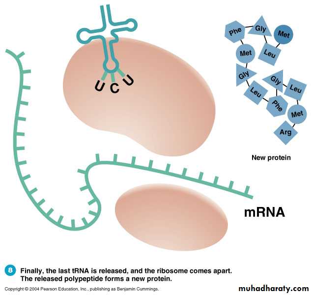 Translation: TerminationFinally, the last tRNA is released, and the ribosomes comes apart.The released polypeptide forms a new protein.
