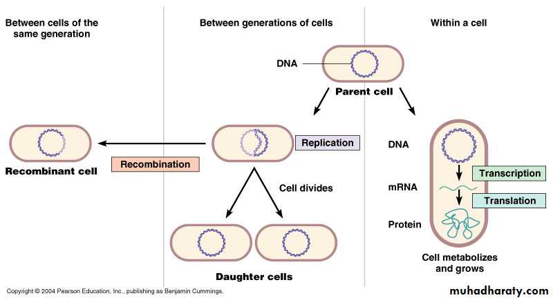 Or from parent cell to daughter cells (during cell division). This is called “Replication”