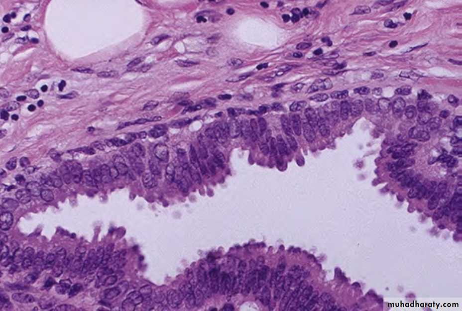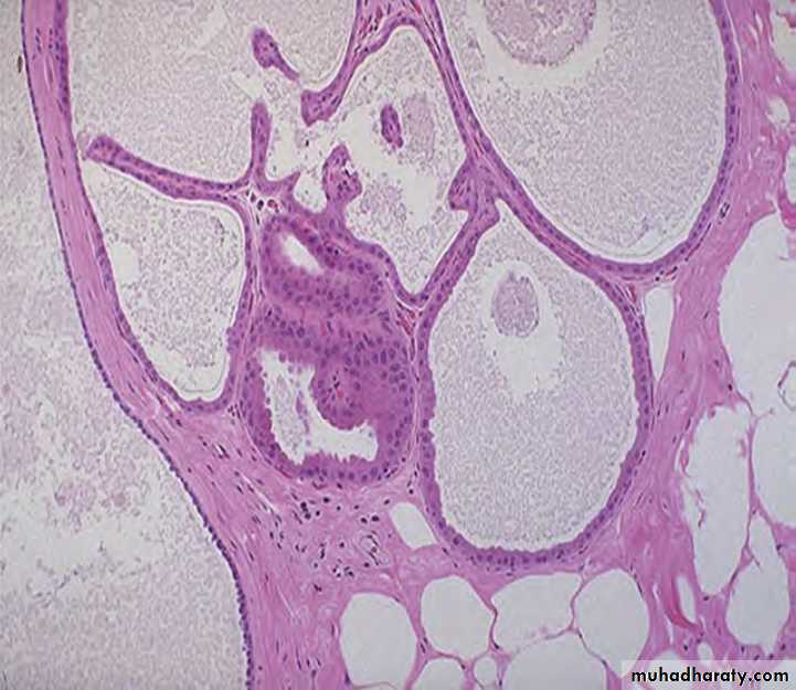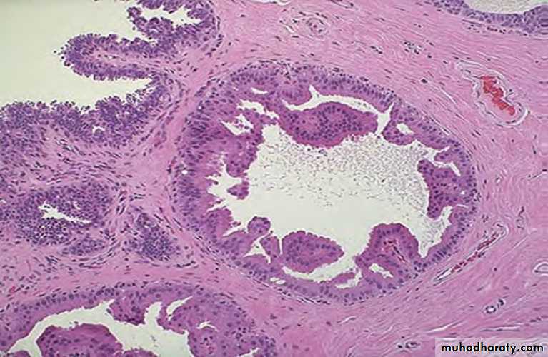 3. Atypical ductal hyperplasia is more ominous ,the proliferated epithelial cells in the atypical ductal hyperplasia partially fill the duct lumen and produce irregular microglandular spaces or cribriform pattern.