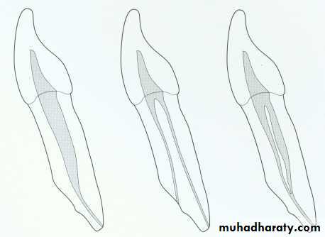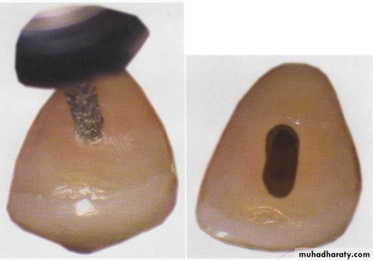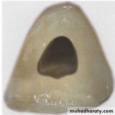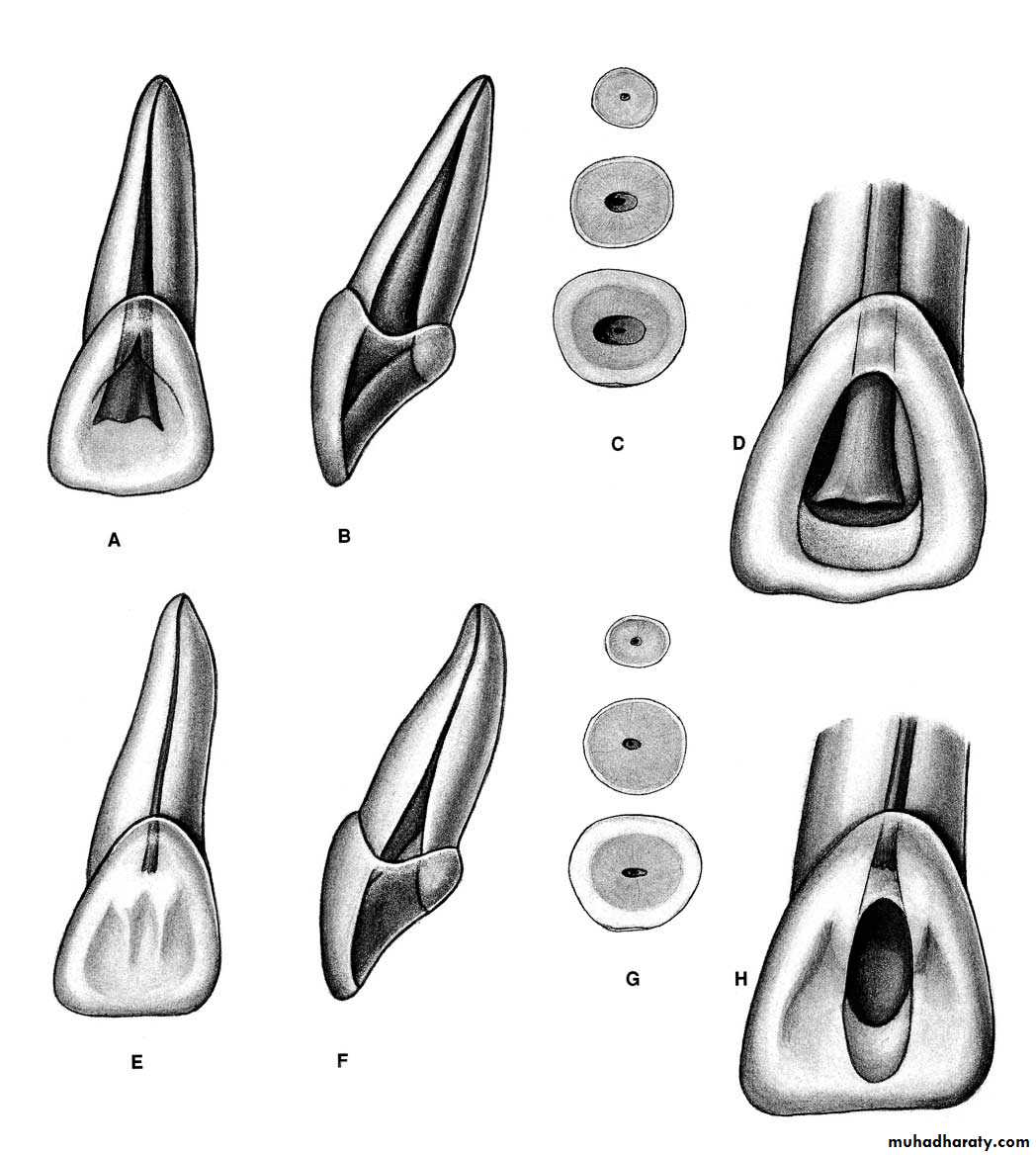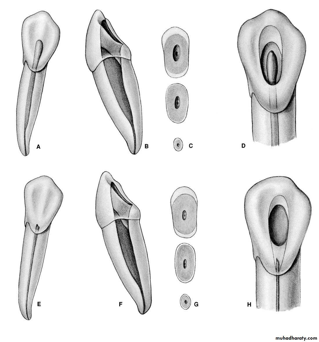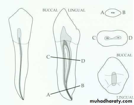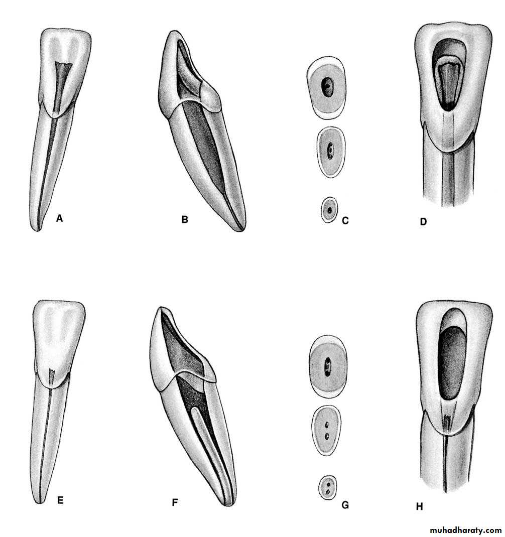• The long axis of crown not with the long axis of root so the direction of the access opening slightly distally to reach the pulp chamber.Single root-type I canal configurationCanal shape: Simple out line, conical in the apical third with pronounced constriction, narrower in diameter than central incisor,