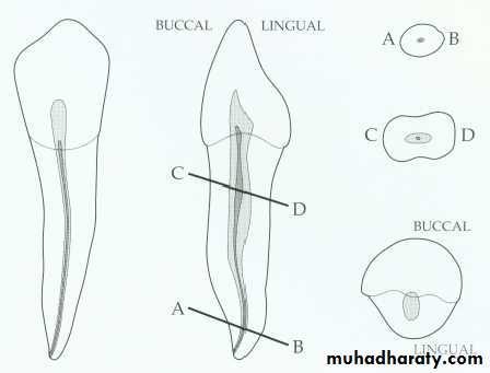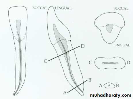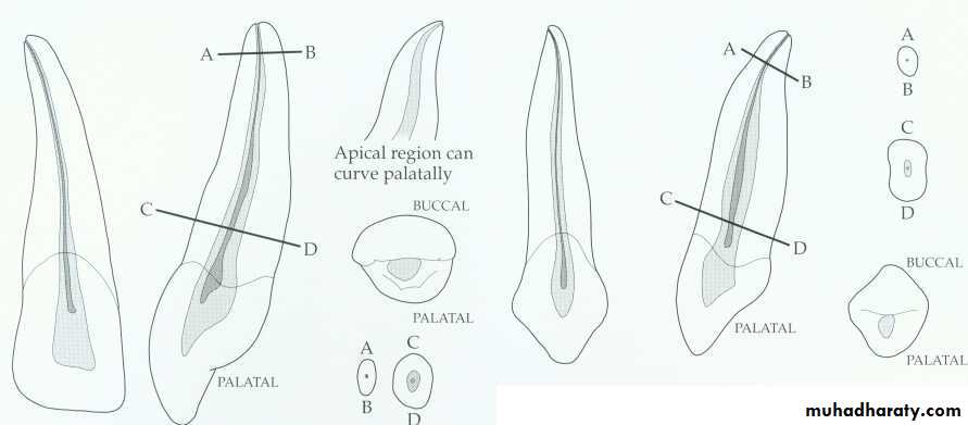 Apical-distal curvatureThe longest tooth in the dental arch. Root slender from labial, bulky proximally.Canal shape: Huge ovoid pulp, wider labio-palatally than mesiodistally Mostly apical curvature in the root→