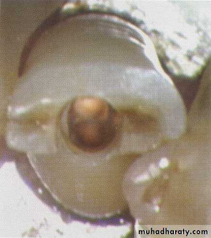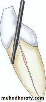 Switch the bur to be parallel to the long axis, keep drilling until entrance to pulp chamber is gained.Remove the pulp chamber roof working from inside the chamber to the outside (pulling motion) to eliminate the remnant of roof of pulp chamber.