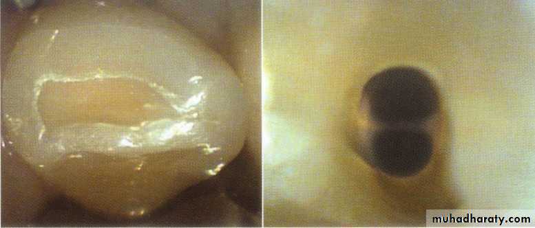 pulp horns should be eliminated, a round bur No. 2 used laterally and incisally to eliminate necrotic tissues which may cause discoloration.