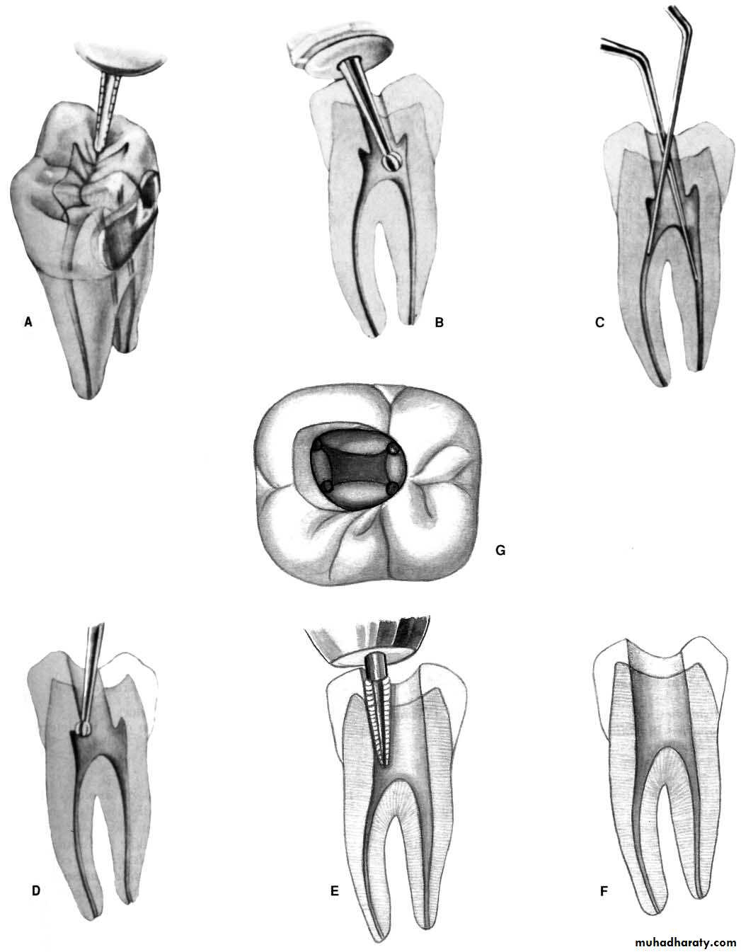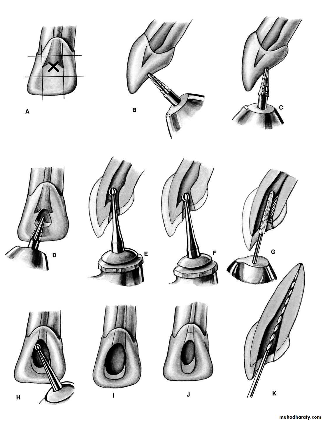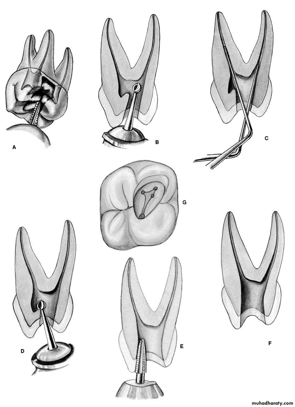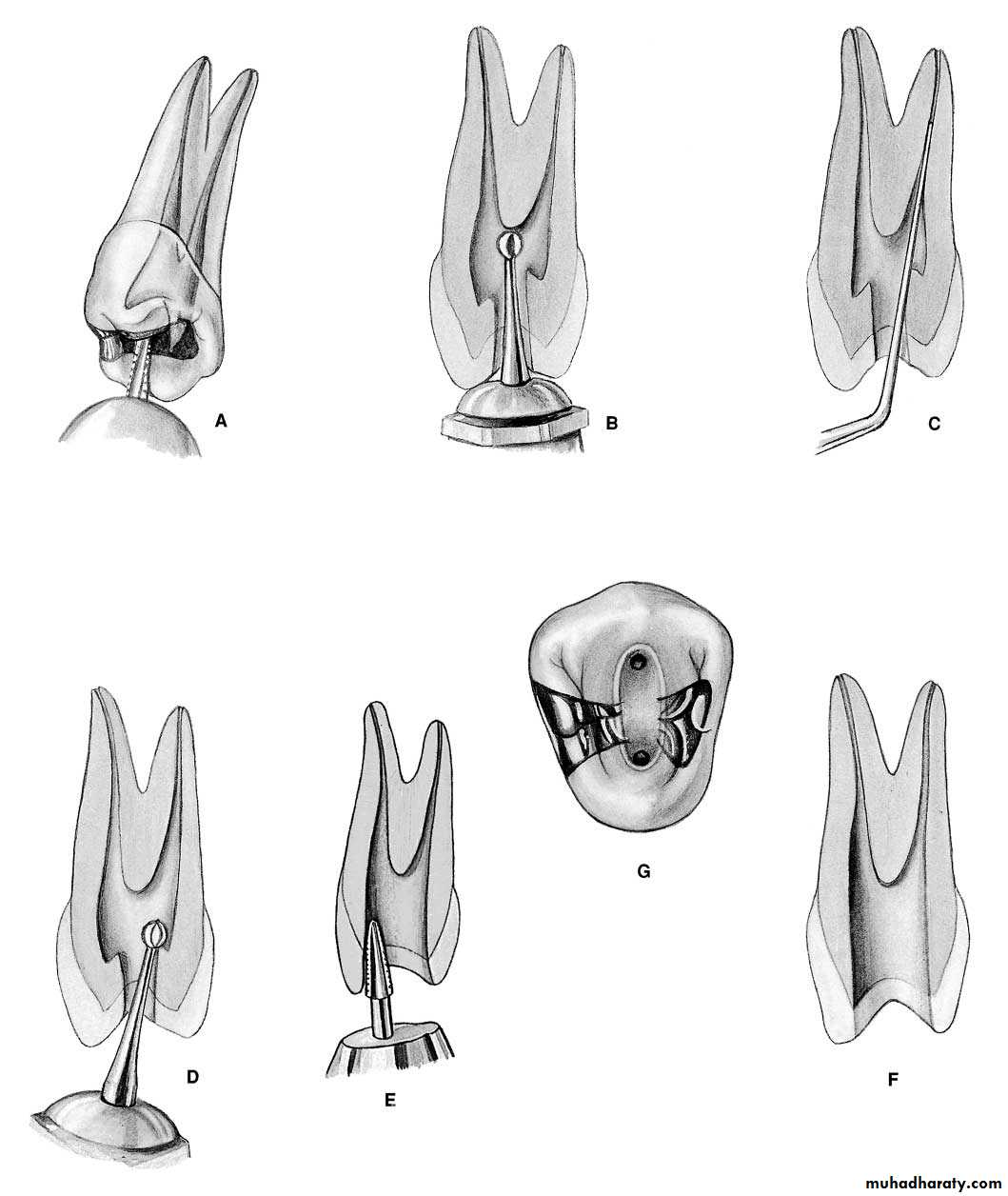 Finishing of the cavity walls is done with a fissure bur to diverge to the access opening which should be ovoid, ovoid preparation reflects the anatomy of the pulp chamber and position of the buccal and lingual canal orifices. Access opening should be funneled downward and flared outward.