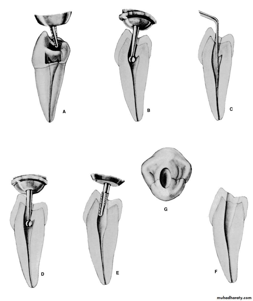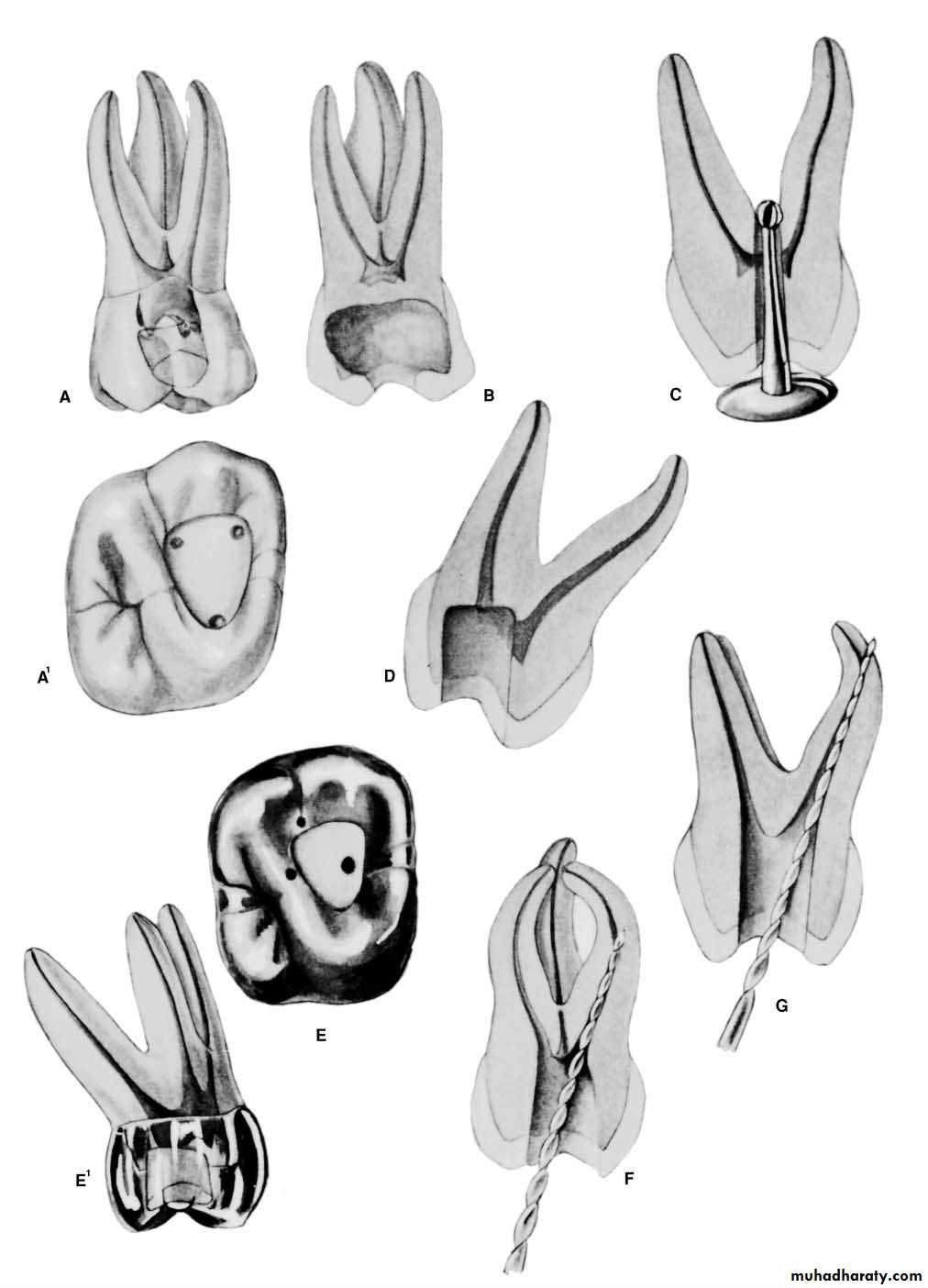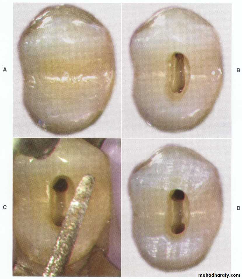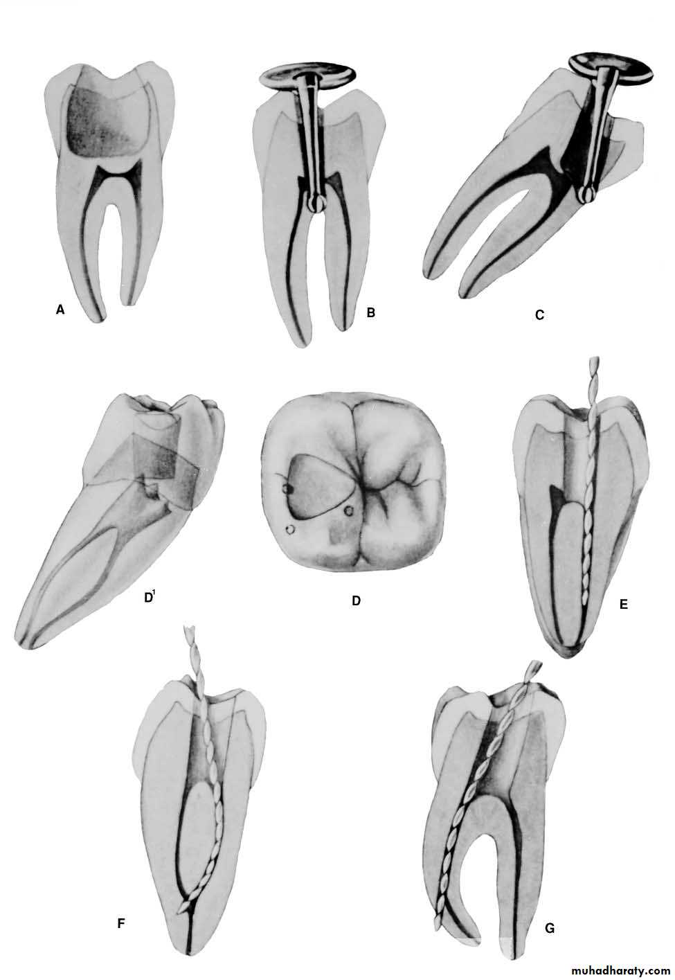 Finishing of the cavity walls is done with a fissure bur to diverge to the access opening which should be ovoid, ovoid preparation reflects the anatomy of the pulp chamber and position of the buccal and lingual canal orifices. Access opening should be funneled downward and flared outward.