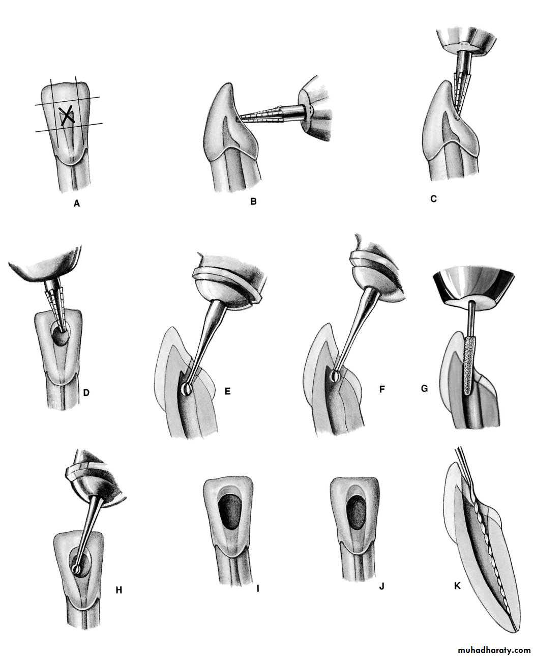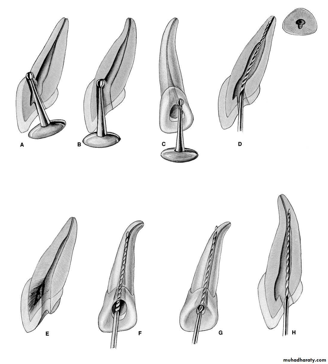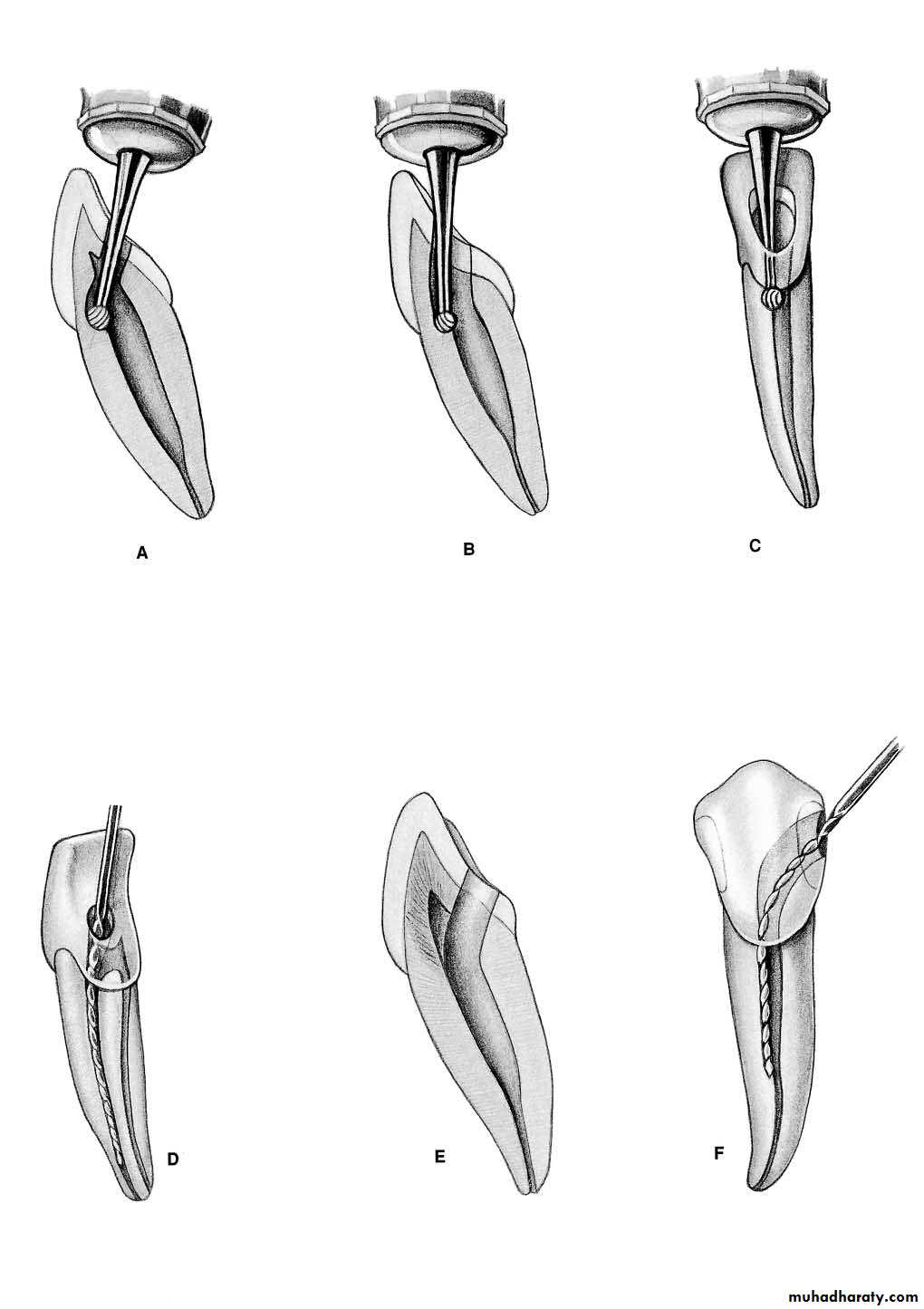Root canal access: it is the initial step toward canal preparation.Why we remove the pulp contents: to remove the infected & necrotic materials in the pulp & to avoid the discoloration of the tooth.Access to ant teeth:Entrance is always gained through lingual surface of all ant. teeth just in the exact center of the tooth and just below the cingulum.Round bur No. 4 operated at right angle to long axis of the tooth, only the enamel is penetrated, once the head of the bur hidden in the tooth structure, stop drilling.