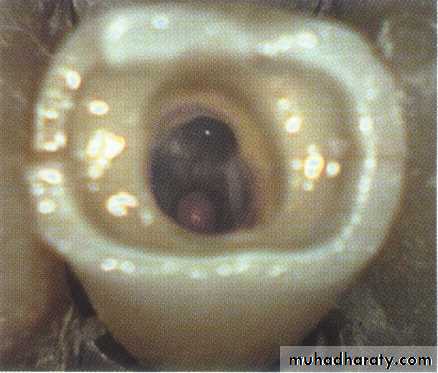 Shallow access opening and instrumentation through the pulp chamber or pulp horn, to know that it is not canal:Sever bleeding cannot be arrested.Color of dentine: floor-dark bluish, roof-white.