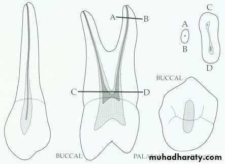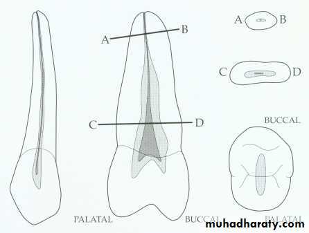 Access opening ovoid, elongated bucco-palatally.Multiple canal possibilities:20% single canal in single root, elliptical or figure 8 in shape, wider buccopalatally than mesiodistally, mistaken as two canals (sudden narrowing).