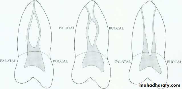 * The distobuccal canal is the shortest and finest of the three canals.* the palatal canal is the largest and longest of three canals and in 50% the canal curved buccally in apical third.