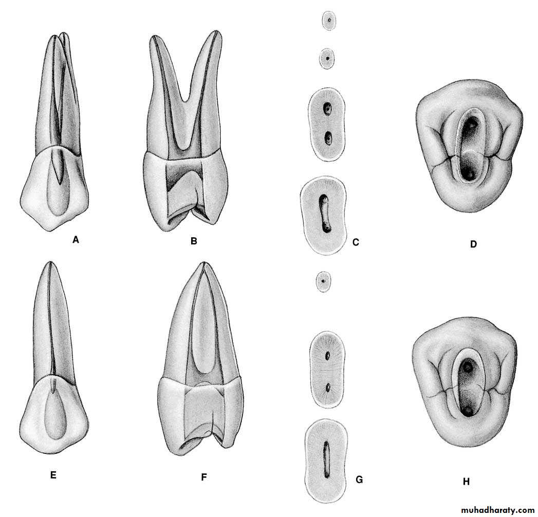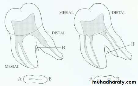 Mandibular first molar.* The Man 1st molar usually has two roots, mesial & distal.*Single mesial root with 2 canals.*the distal root is curved mesially.&mesial root curved distally.*the two-rooted molar usually has a canal configuration of three canals.