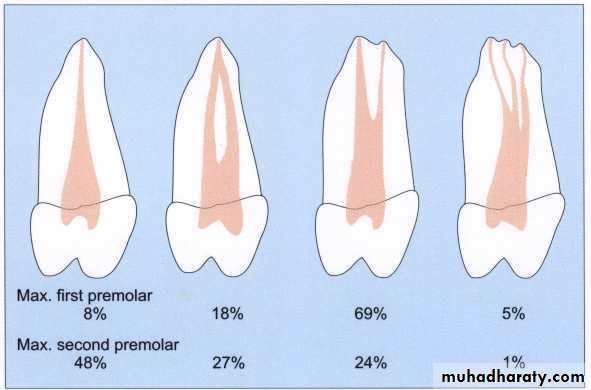 Maxillary 2nd premolar: Mostly single rootCanal shape: Single canal, enormous and very wide cervical portion in bucco-palatal direction, mid root ovoid, apical round.Canal orifice: centrally located and often appears as a slot than as a single ovoid opening.Access opening: Ovoid, accessory and lateral canal common.Multiple canals possibilities: 40% 2 canals, 60% one canal, average length:21.5mm.