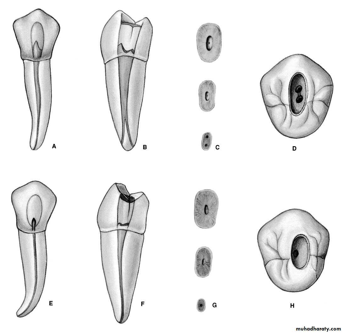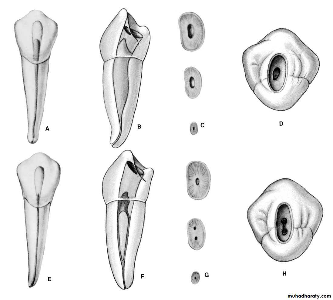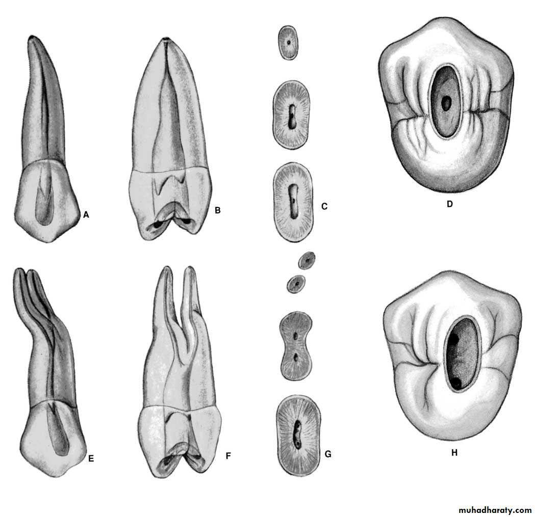 Mandibular canine:Canal shape: The canal is somewhat ovoid at the cervical portion, round at the apical portion, narrow mesiodistally, apical labial curvature is present.Pulp camber: Gradually merging with root canal, average length: 23mm.Possibility of 2 canal7% one root-two canals5% two separate roots with two separated canals.