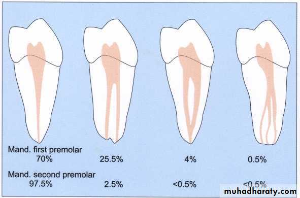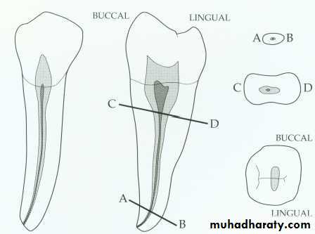 Mandibular 1st premolar:Well developed buccal cusp and a small lingual cusp, the root is more rounded than 2nd premolar and shorter.Pulp chamber: Ovoid, buccal pulp horn higher.Canal shape: At cervical level, wide in bucco-lingual dimension, mid root continues ovoid, apical third round.Possibility of 2 canals is not uncommon, access opening, ovoid. Access made slightly buccally to the central groove. Because the tooth inclines