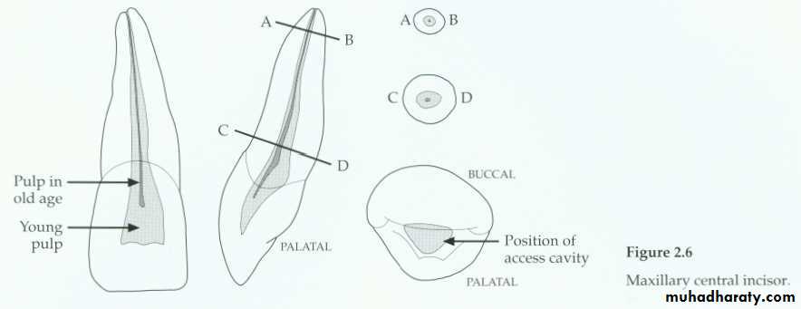 Oval at cervical area, round apicallyPulp chamber: Tend to be gradually merging to root canal, smaller than that for max. central.Average length 23mm