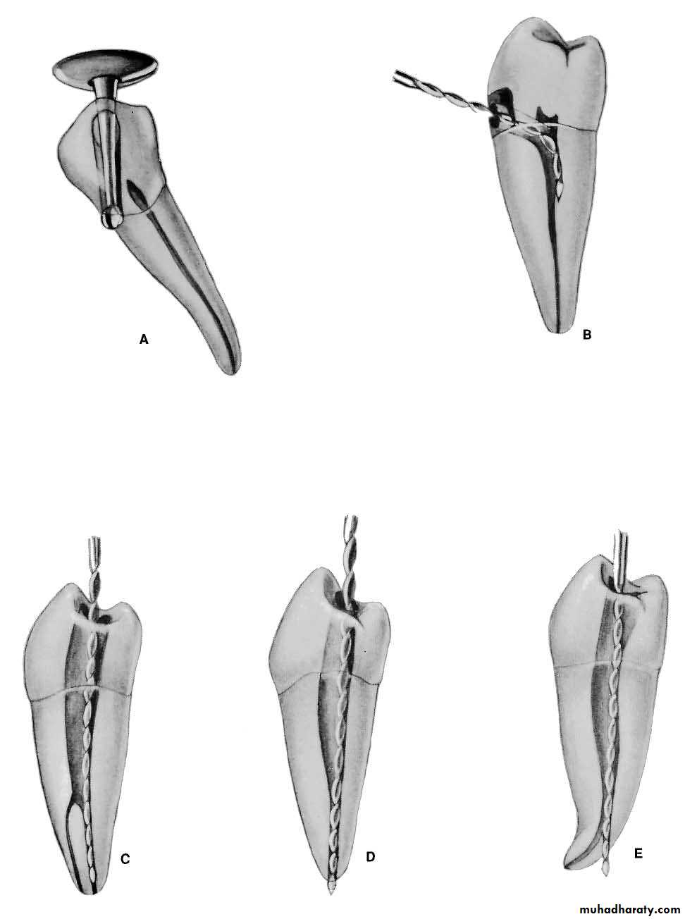 D.FAULTY ALIGNMENT: of the access cavity through full veneer restoration placed to “straighten” the crown of a rotated tooth. Careful examination of the radiograph would reveal the rotated body of the tooth.E.BROKEN INSTRUMENT: twisted off in a“cross-over” canal. This frequent occurrence may be obviated by extending the internal preparation to straighten the canals (dotted line).