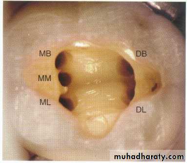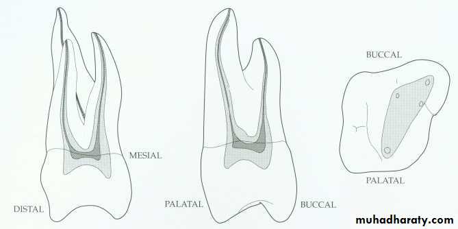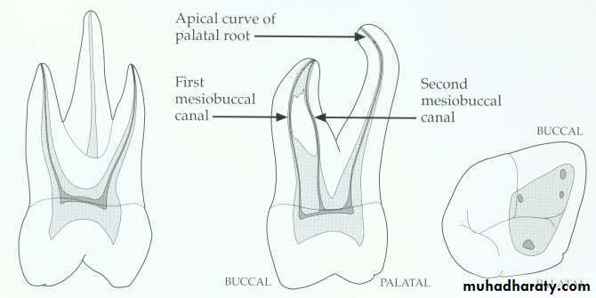 *the minor mesiobuccal canal if present lies on a line joining the main mesiobuccal and palatal canal orifices.*the distobuccal root is closer to the middle of the tooth than to the distal wall.