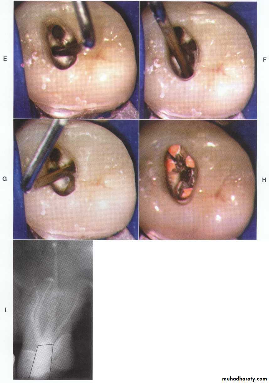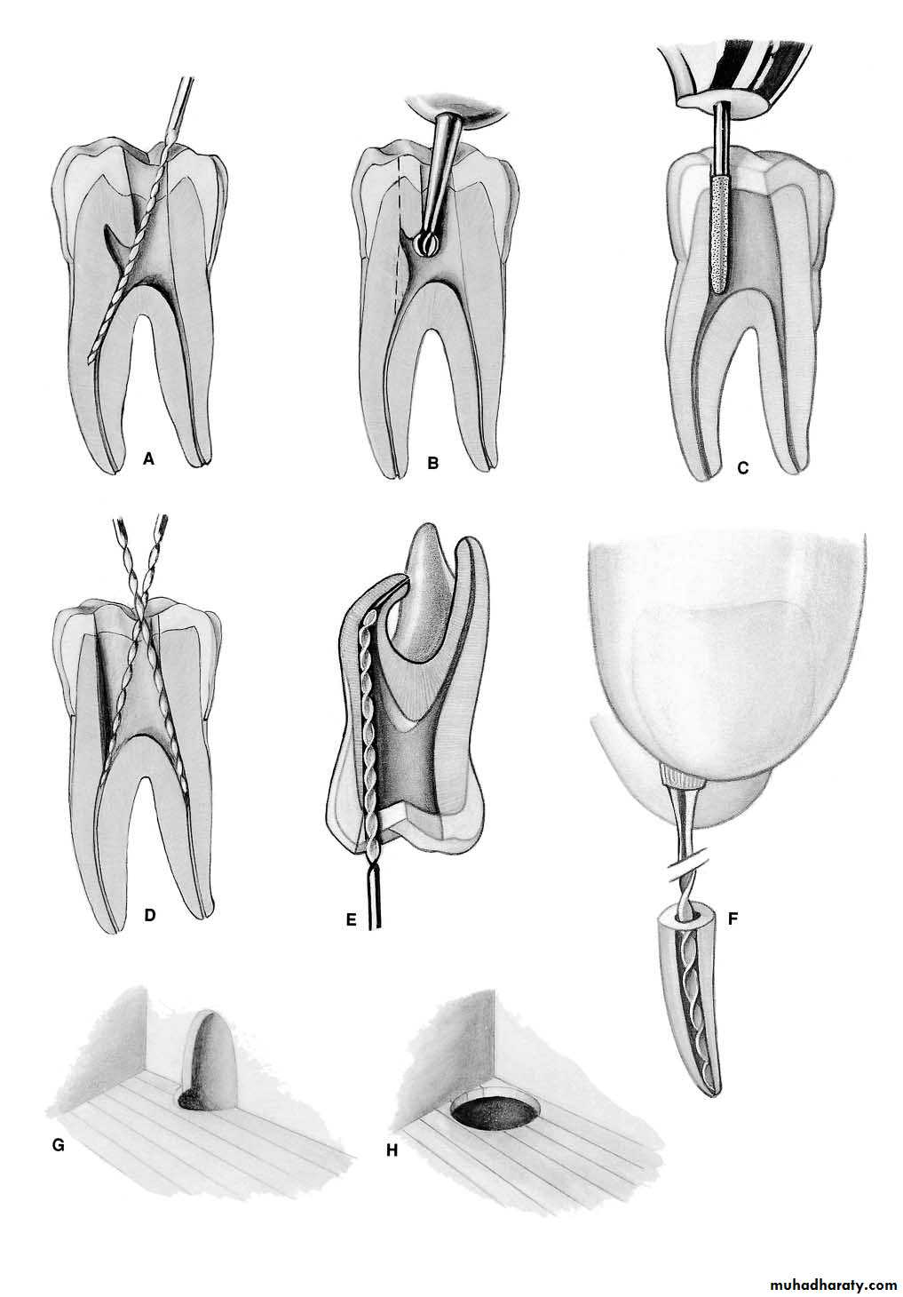 G.PERFORATION: at the apical-distal curve caused by using too large an instrument through an inadequate preparation placed too far gingivally. H.LEDGE: formation at the apical-labial curve caused by failure to complete the convenience extension. The shaft of the instrument rides on the cavity margin and “shoulder.”