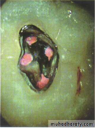 *Enlargement of buccal canals is accomplished by reaming and filling.*A dark cavity floor with lines connecting orifice is in marked contrast to white walls.Maxillary Molar TeethErrors in cavity Preparation