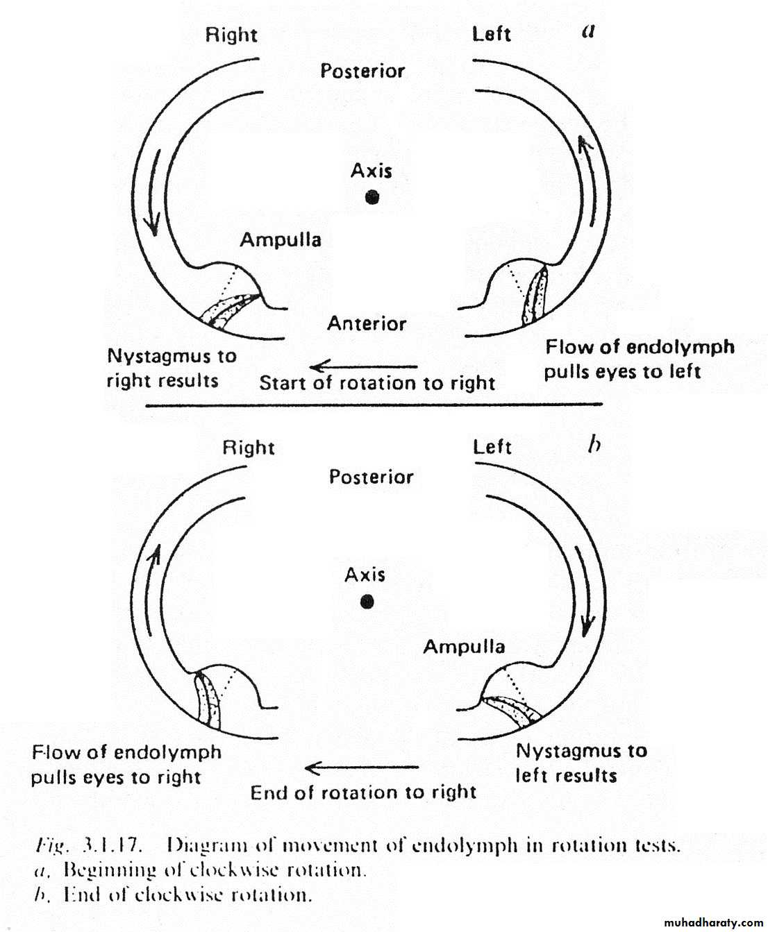 This mechanism can be explained by considering rotation in a rotating chair about vertical axis, when the rotation (for example) to the right, this result in movement of endolymph and cupula to the left, which means that the cupula and endolymph in the right side move towards the ampulla which result in ↑ impulse rate from the right crista, and the cupula and endolymph move away from the ampulla of the left side which results in ↓ impulse rate from the left crista. This ↑ impulse rate from the right crista and ↓ impulse rate from left crista will lead to sense of rotation to the right side. Also there will be deviation of the eye to the left side (slow component of nystagmus) and then rapid deviation of the eye to the right side (fast component of nystagmus), so there will be nystagmus directed to the right side (direction of nystagmus is determined by the direction of fast component).