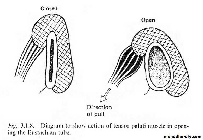 The Eustachian tube connects the tympanic cavity with the nasophrynx, in the adult it is about 36 mm in length. From its pharyngeal end it runs upwards, laterally and backwards. In infants the tube is shorter, wider and more horizontal than in adults. The tube has 2 parts, a pharyngeal cartilaginous part which forms 2/3 of its length, and a tympanic bony 1/3 portion. The upper and medial walls of the pharyngeal portion of the tube are formed by a plate of cartilage. The lateral wall is membranous.There are 3 muscles attached to Eustachian tube these are: