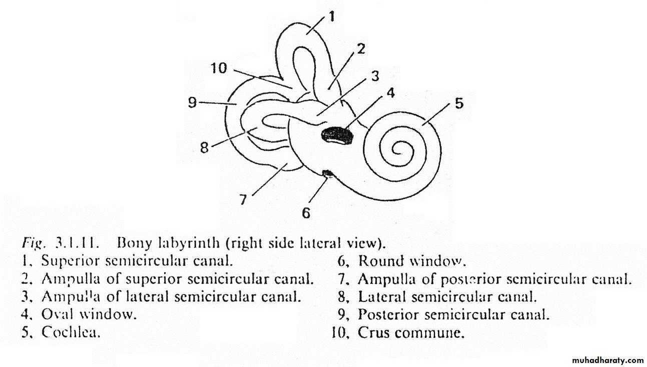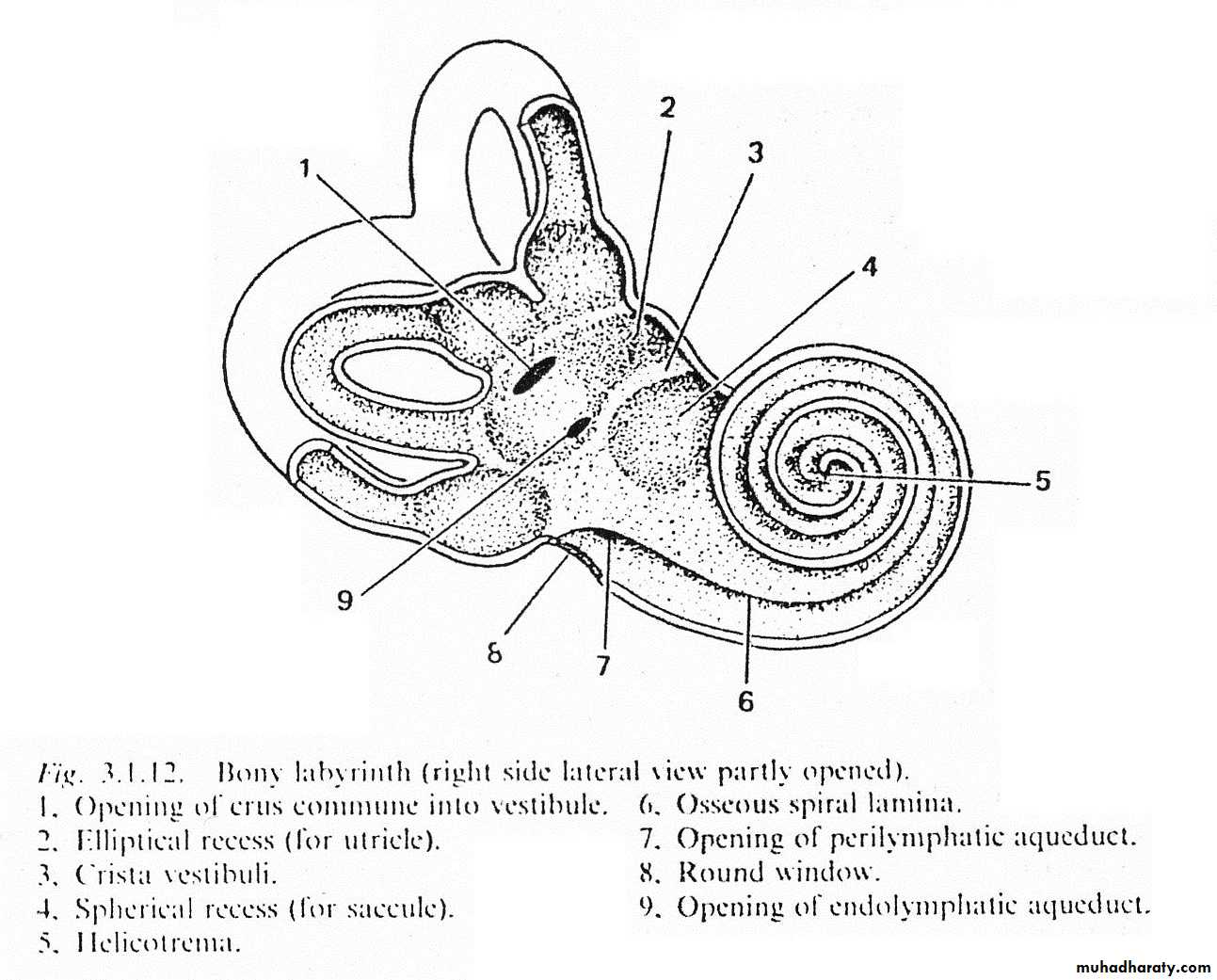 A-Vestibule: The vestibule is the central portion of bony labyrinth, ovoid chamber lying between the middle ear and fundus of internal auditory meatus. On the lateral wall there is the opening of oval window closed by stapes footplate and annular ligament. On the medial wall anteriorly there is spherical recess houses the saccule and perforated by fibers of inferior vestibular nerve. Behind the spherical recess is a ridge, vestibular crest (crista vestibuli).Above and behind the crest is an elliptical recess which houses the utricle. The posterior wall of the vestibule contains 5 openings of the semicircular canals. The anterior wall of the vestibule contains opening into scala vestibuli, of cochlea.