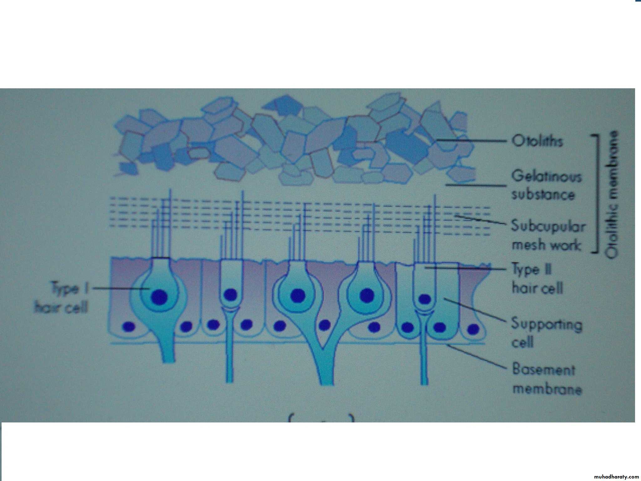 In the macula, a gelatinous material overlies the sensory hair cells, the stereocilia and kinocilium also project into the under surface of this gelatinous membrane which is called otoconial membrane.