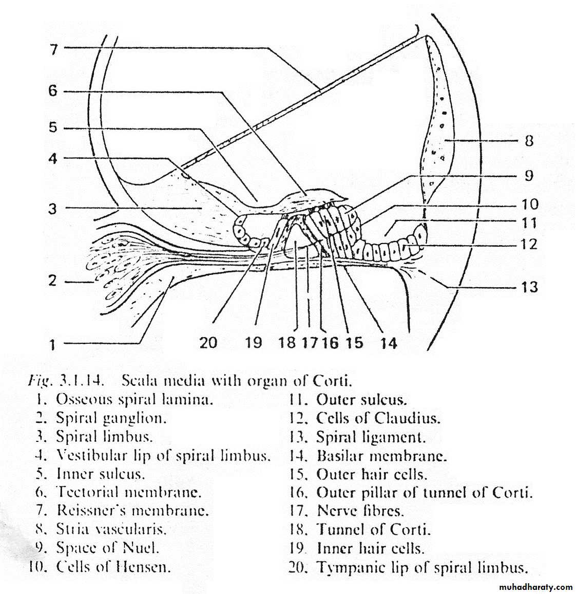 The floor is formed by 1 Bony spiral lamina which has upper and lower ridges and, 2 Membranous spiral lamina which extends from the lower ridge of bony spiral lamina to the lateral wall of cochlear duct. The upper ridge gives rise to tectorial membrane. The cochlear nerve fibers pass from the modiolus in canals in the bony spiral lamina and then through membranous spiral lamina to organ of Corti (the sensory auditory organ) which lies on the upper surface of membranous spiral lamina.The organ of Corti is a ridge-like structure containing the auditory sensory cells and supporting cells. The sensory cells are arranged as single row of inner hair cells and 3, 4 or 5 rows of outer hair cells. The inner hair cells are separated from outer hair cells by tunnel of Corti. The hair cells have stereocilia or "hairs" arising from its upper surface.