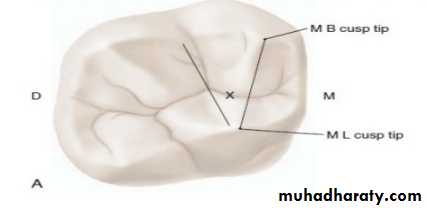 • Starting location of access opening is on the central groove halfway between the mesial and distal boundaries The mesial boundary is a line joining the mesial cusp tips and the distal boundary is the line joining buccal and the lingual grooves .•The enamel is penetrated with No. 4 round bur on the central groove midway between the mesial and distal boundaries., the bur directed towards the distal root where the greatest space in the chamber exist.