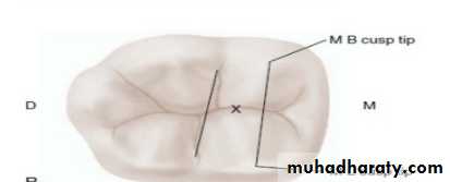 • The final outline form is triangular in shape the base is toward the buccal and the apex is to the lingual, with the canal orifice positioned at each angle of the triangle. The cavity is entirely within the mesial half of the tooth and need not invade the transverse ridge.