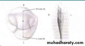 1• Determine the site of access opening on the tooth. In premolars, it is through the occlusal surface between buccal and the lingual cusp tips . Slight variations exist between mandibular and maxillary premolars because of the lingual tilt of mandibular premolars. Therefore, in maxillary premolars, the point of entry is on the central groove between the cusp tips.