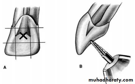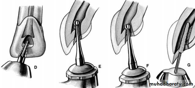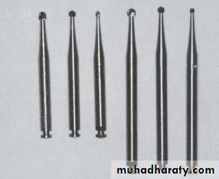 several types of burs will be used to accomplish good access preparation. Fissure burs are used in the initial stage of access preparation to establish the correct outline form ,Round burs are used to lift the roof of the pulp chamber and eliminate overhanging dentine ,Tapered Non end-cutting bur is used to 'lift lid' of pulp chamber and refine cavity.