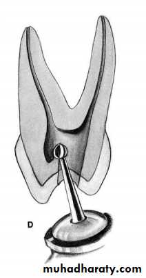 Spreaders and pluggersAre the instruments used to compact the gutta-percha into root canal during obturationA- Hand Spreaders• They are made from stainless steel and are designed tofacilitate the placement of accessory gutta-percha pointsaround the master cone during lateral compaction technique• These spreaders do not have standardized size and shape.• They are not used routinely because excessive pressure onthe root may cause fracture of root.