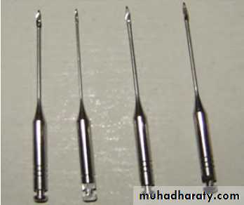 • Traditional engine driven instruments include Gates-Glidden drills which have flame-shaped cutting point mounted on long thin shaft attached to a latch type shank.• Gates-Gliddens are available in a set from 1 to 6 with thediameters from 0.5 to 1.5 mm.• Due to their design Gates-Glidden drills are side cuttinginstruments with safety tips.• They should be used at the speed of 750-1500 rpm. in brushing strokes.• Safety design of Gates-Gliddens is that its weakest part lies at the junction of shank and shaft of the instrument. If its cutting tip jams against the canal wall, fracture occurs at the junction of shank and the shaft but not at the tip of the instrument. This makes the easy removal of fractured drill from the canal.