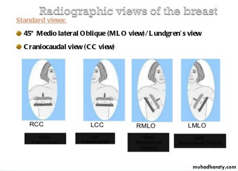 The mediolateral oblique (MLO) view is one of standard mammographic views. It is the most important projection as it allows to depict most breast tissue.The craniocaudal view (CC view), is one of the two standard projections in a screening mammography. It must show the medial part as well the external lateral portion of the breast as much as possible.