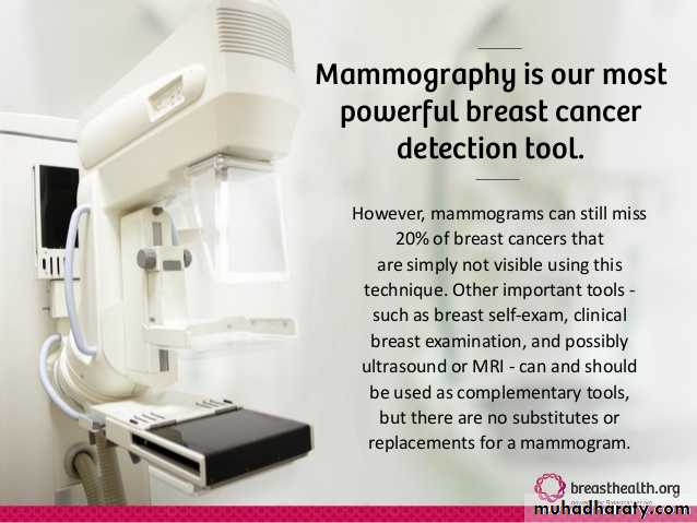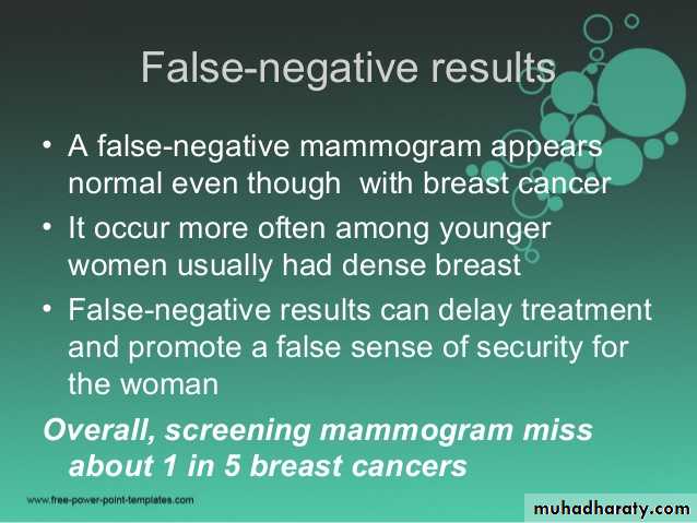 Women with a breast lump need to have a mammogram of both breasts. A mammogram is estimated to be able to detect about 90% of breast cancers. This means that about 10% of breast cancers are missed by mammography. Therefore, if a woman or her physician feels a lump and the mammogram is normal, further studies or biopsies are carried out to rule out cancer. Sometimes, a certain pattern of calcium deposits appears on the mammogram that makes the doctor suspicious of cancer. In these cases, it is often recommended that a biopsy be taken that is guided by mammogram images to be sure the correct area is sampledBreast cancer