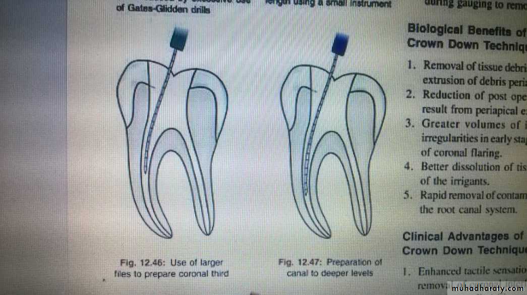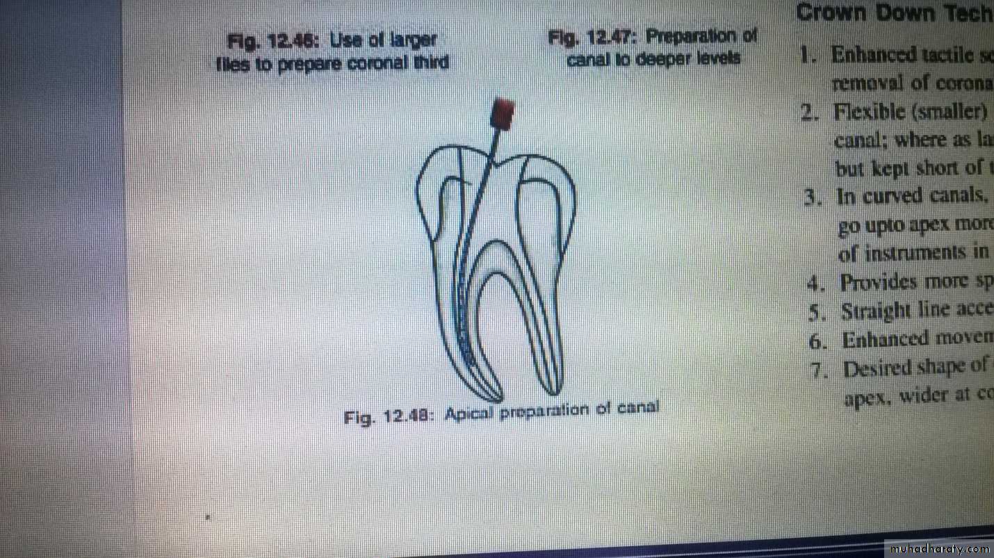 The standardized technique adopts the same working length definition for all instruments introduced into a root canal and therefore relies on the inherent shape of the instruments to impart the final shape to the canal. Clinicians utilized a preparation technique of sequentially enlarging the canal space with smaller to larger instruments at the corrected working length. This technique was adequate for preparing the canals that were relatively straight however, in curved canals, procedural errors were identified with the technique.Crown-Down Technique: Crown down technique is approach used for root canal preparation starting at the orifice with larger instrument and working up to apex with smaller instruments .