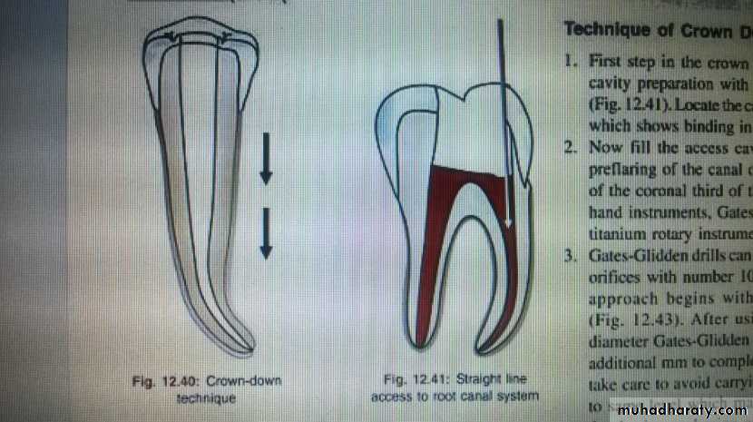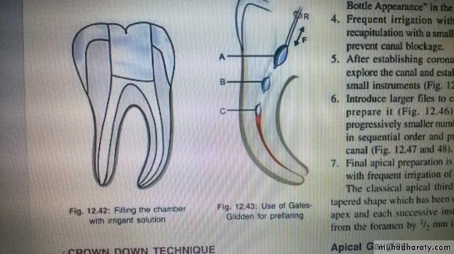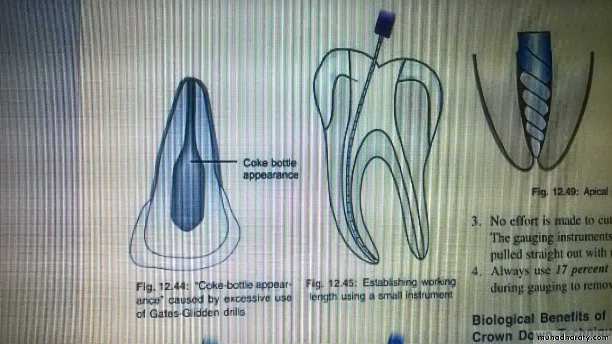 3- Gates glidden drills can be used after scouting the canal orifices with number 10 or 15 files. the crown down approach begins with larger gates glidden first. After using this subsequent, smaller diameters gates glidden are worked in the canal with additional mm to complete coronal flarning