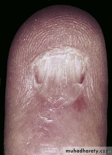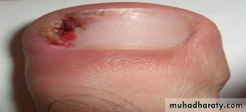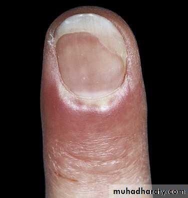Bacterial and viral infections:ACUTE PARONYCHIA: The rapid onset of painful, bright red swelling of the proximal and lateral nailfold may occur spontaneously or may follow trauma or manipulation. Infections present with an accumulation of purulent material behind the cuticle .