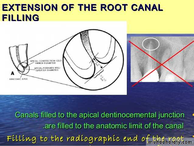 Canals filled to the apical dentinocemental junctionThey are filled to the anatomic limit of the canal