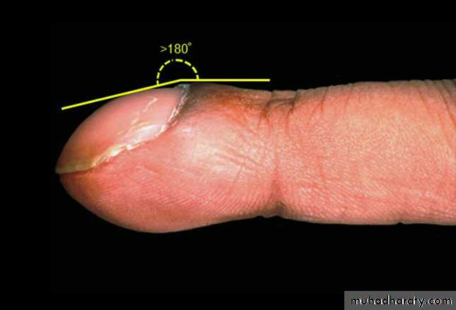 What is the name of this nail disorder? And with which condition may associate? What is the name of the angle shown in the slide?