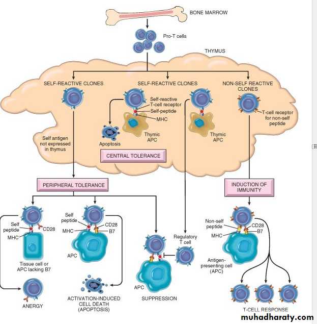 auto-reactive T-cells are eliminated in the thymus following interaction with self antigen during their differentiation (negative selection).