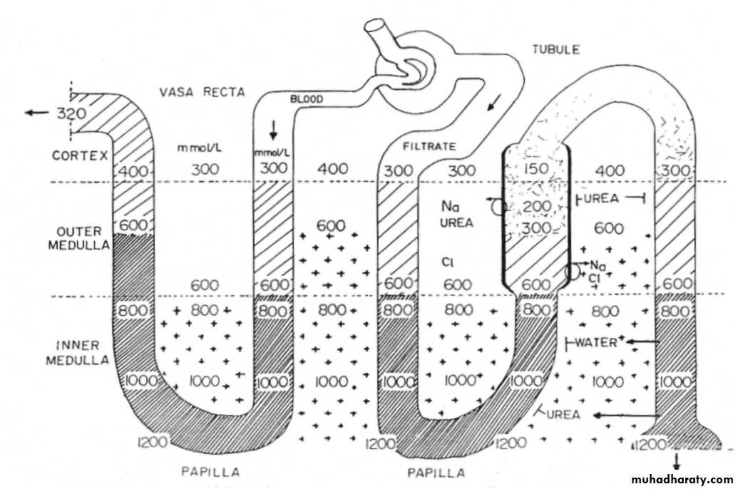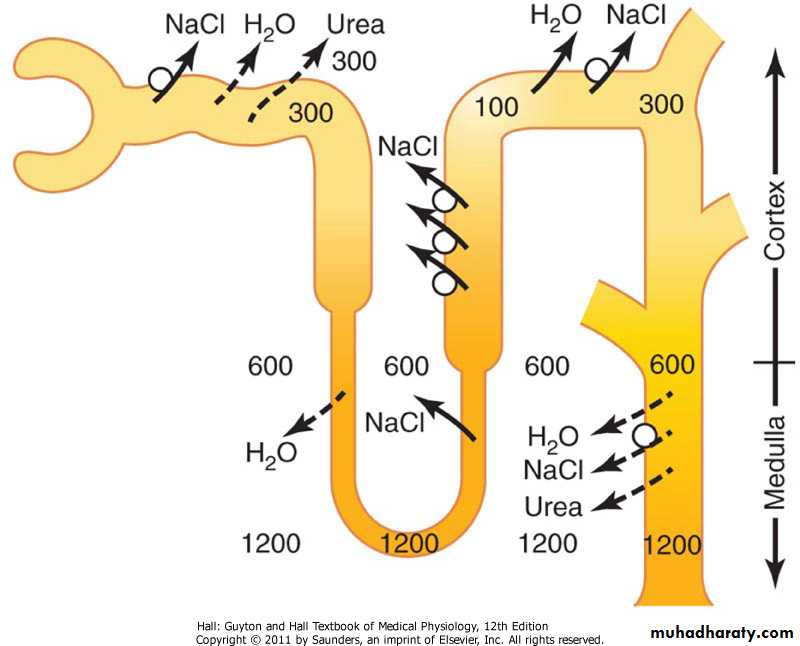 The salt (NaCl) is extruded into the surrounding fluid. Unlike the epithelial walls of the proximal tubule, however, the walls of the ascending limb of the loop of Henle are not permeable to water. The tubular fluid thus becomes increasingly dilute as it ascends toward the cortex, whereas the interstitial fluid around the loops of Henle in the medulla becomes increasingly more concentrated. By means of these processes, the tubular fluid that enters the distal tubule in the cortex is made hypotonic (with a concentration of about 100 mOsm), whereas the interstitial fluid in the medulla is made hypertonic.