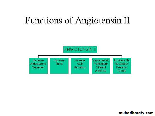 Secretion of renin into the blood thus results in the formation of angiotensin I, which is then converted to angiotensin II (an eight-amino-acid polypeptide) by angiotensin-converting enzyme (ACE). This conversion occurs primarily as blood passes through the capillaries of the lungs, where most of the converting enzyme is present. Angiotensin II, in addition to its other effects, stimulates the adrenal cortex to secrete aldosterone. Thus, secretion of renin from the granular cells of the juxtaglomerular apparatus initiates the reninangiotensin- aldosterone system. Conditions that result in increased renin secretion cause increased aldosterone secretion and, by this means, promote the reabsorption of Na+ from cortical collecting duct into the blood.