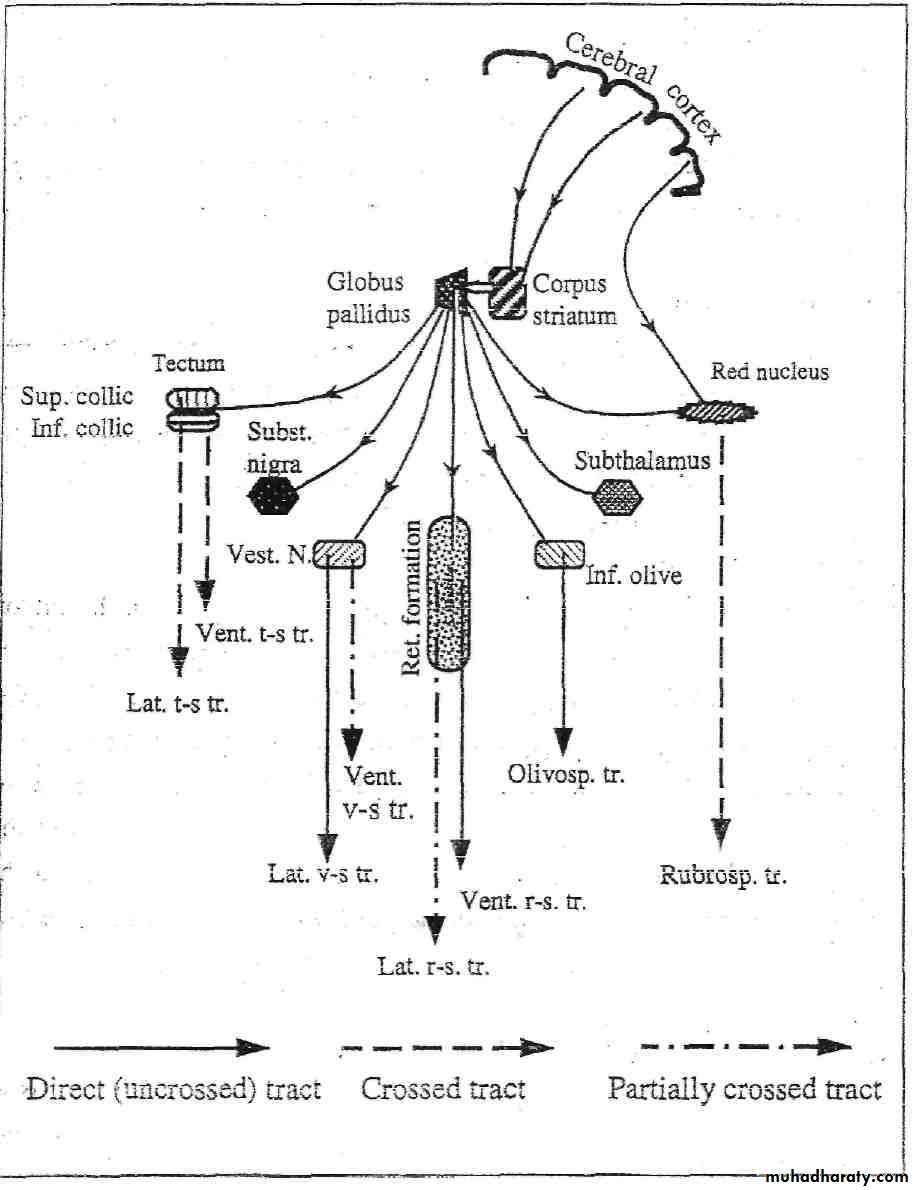 • The lateral vestibulospinal tract: Originates from the vestibularnucleus, descends uncrossed to terminate on the alpha and gamma motor neurons.