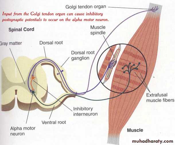 Prevent tearing of the muscle or avulsion of the tendon from its attachments to the bone.Equalize the tension of the separate muscle fibers (that is fibers which exert excess tension become inhibited by the reflex and the reverse is true. This will spread the muscle load over all fibers and would prevent damage in isolated areas of a muscle where small numbers of fibers might be overloaded.